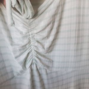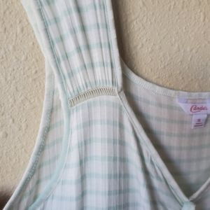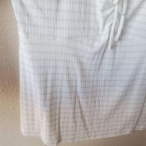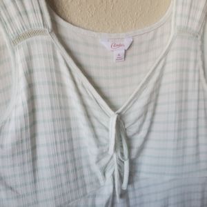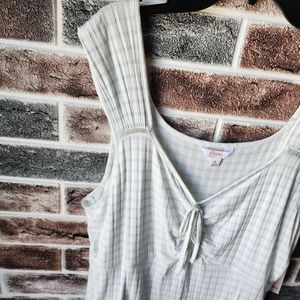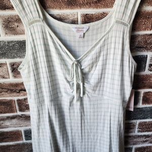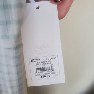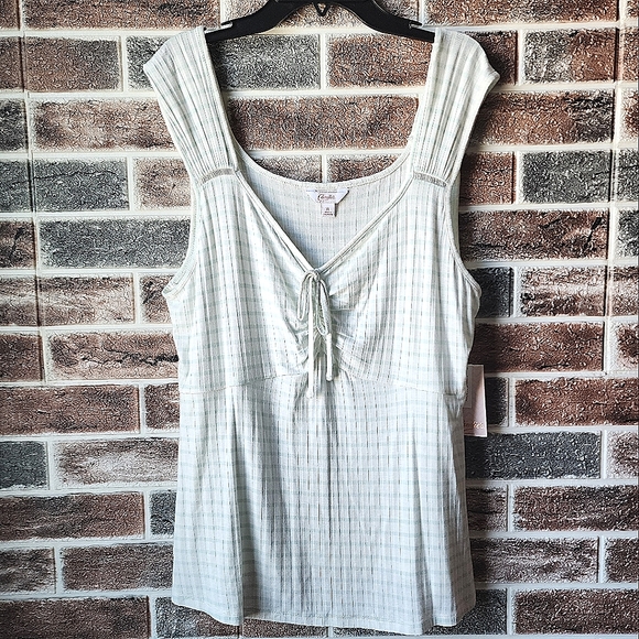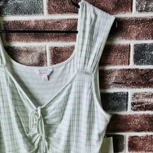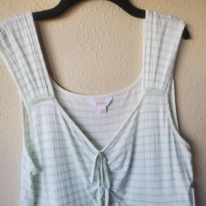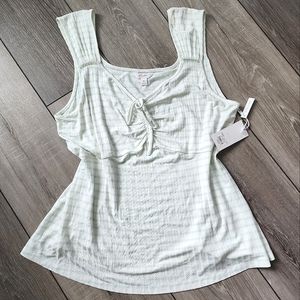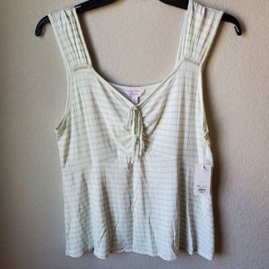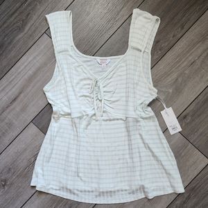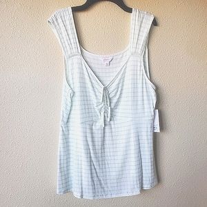 Brand new with tags. Pretty and flirty XL white tank top with mint green vertical stripes. Vertical detailing stripes in fabric make for very flattering fit. Wider straps and ruched tie front. Very pretty to dress up or down and wear all season long.