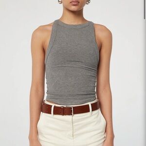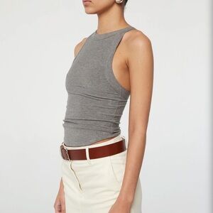 The Ximeno, one of our core tank tops and crafted from our signature light-weight stretch-rib. It is cut for a close fit and features thick binding, asymmetric straps, a curved baseball hem and an open back. Double-lined to minimize sheerness Pair with slinky slip skirts or oversized trousers.