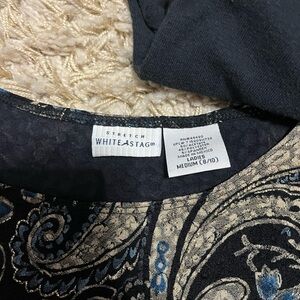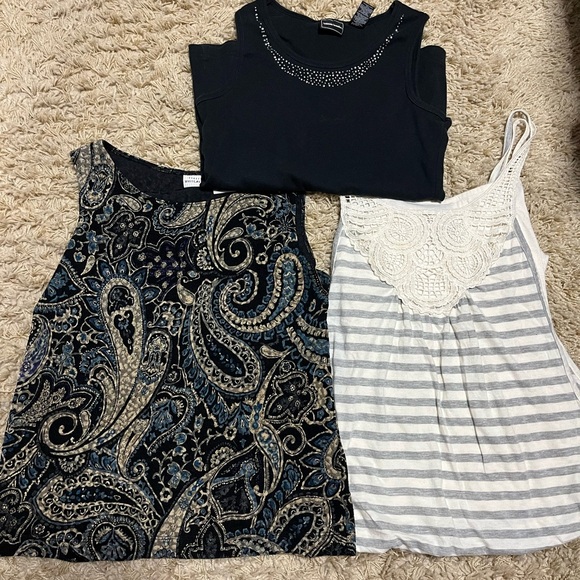 Includes a black top with embellishments, a paisley print, and a striped design with lace.