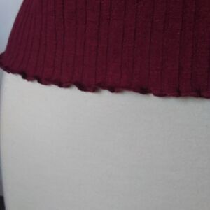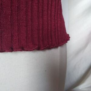 No Boundaries burgundy lightweight ribbed camisole with white trim and ruffle at the hem. Sort of looks like a sweater because of the ribbing. The tag says size 13-15 juniors, but please read the measurements, as the measurements are also consistent with a size small women's. Looks great with a cardigan and a plaid school girl skirt. Or, any mini or midi skirt. Also, can be sporty with a bomber jacket and jeans / shorts / skirts. It can be a more preppy academia with blazers... perhaps corduroy with elbow patches. Can also be worn to dress down a suit or blazer for a more casual office / career look.
