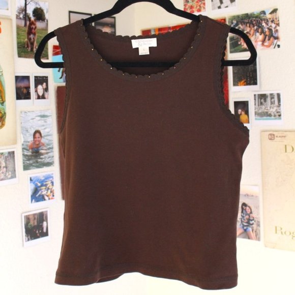 Dark brown tank top with cute discrete beading around the neck line. Fits more like a medium.