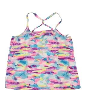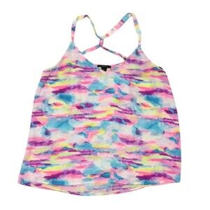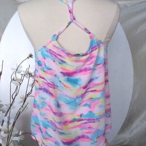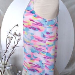 Bright and vibrant chiffon watercolor tank top. The material is sheer but not overly see through. Cute twisted criss cross back. Summer time will be here soon. The hot summer days will be so fun in this lightweight and eye catching top. In excellent pre-owned condition with no flaws.