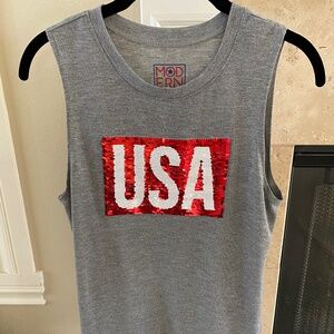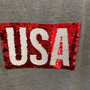 Sequins change from USA Flag image & “USA” lwtters with just a swipe of hand to angle sequins up or downward to show image!