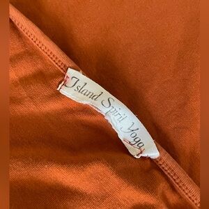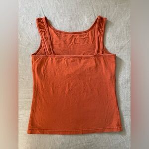 Burnt orange tank top with a red geometric pattern. Built in light support bra, high neck, and square back. Super comfy, cute and flattering!