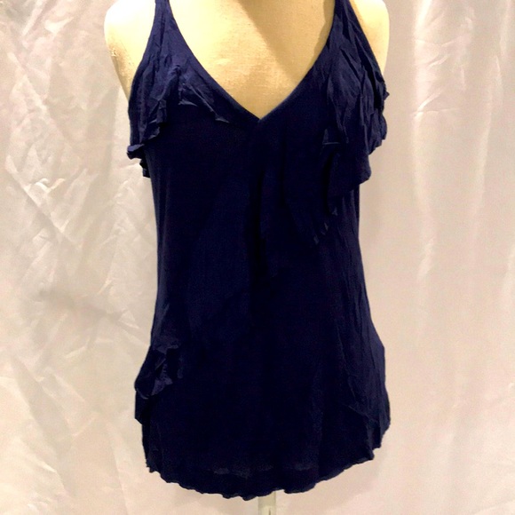 Ruffle detail along the neckline and in the back, soft material, v neck detail, navy blue color, size small