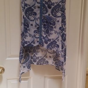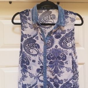 hi lo paisley print sleeveless topper with bottons and denim collar