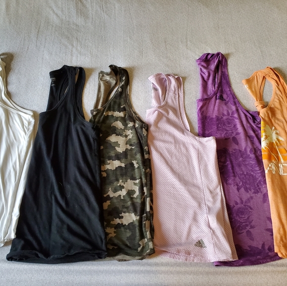 Variety of brands. Orange tank is from Lego Land, three tanks on the left are Missimo and two purple tanks are Adidas. $10 each