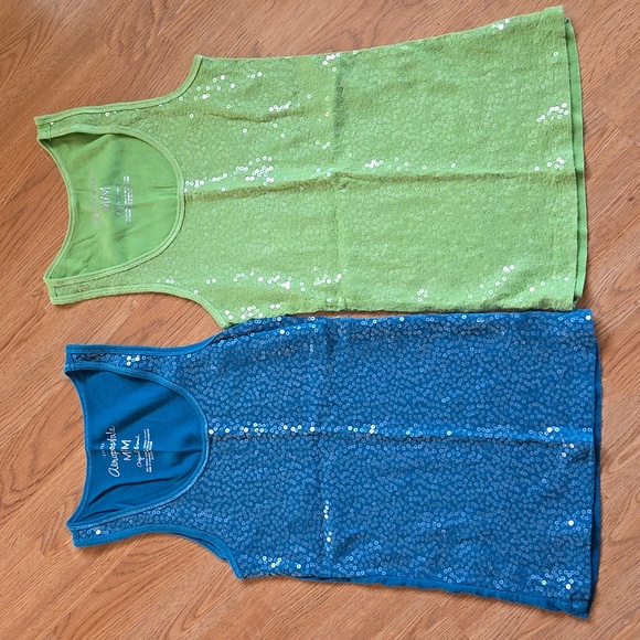 2 tank tops (blue/aqua and lime green) with clear sequins