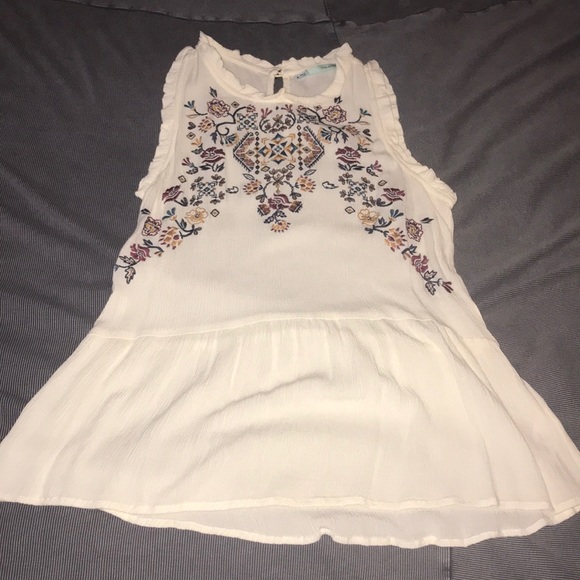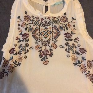 Maurice’s blouse, white with stitched detail in front , ruffles around the neck and arms.
