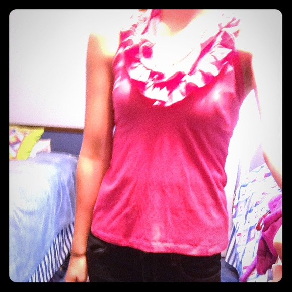 Hot pink tank that ties around the neck. Has a ruffled neck that is also v neck.