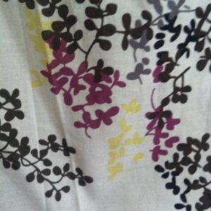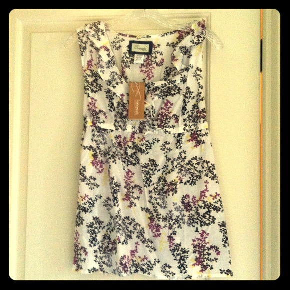 White tank top with black purple and yellow detailing. Ruffle v neck very light weight perfect for spring