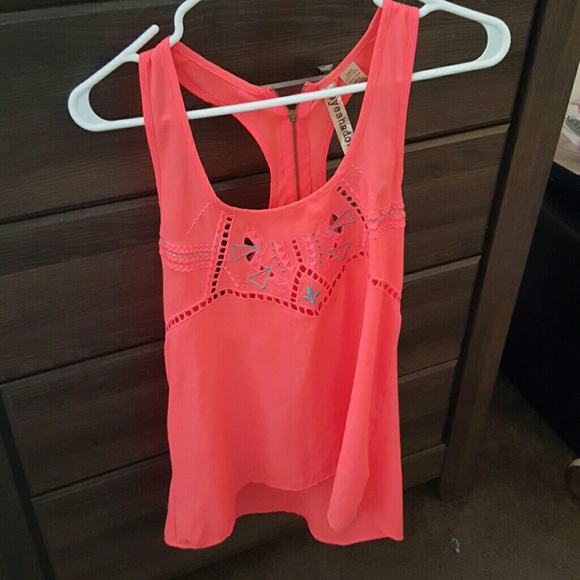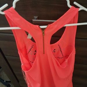 Coral colored tank top with beautiful design on front and zipper in back