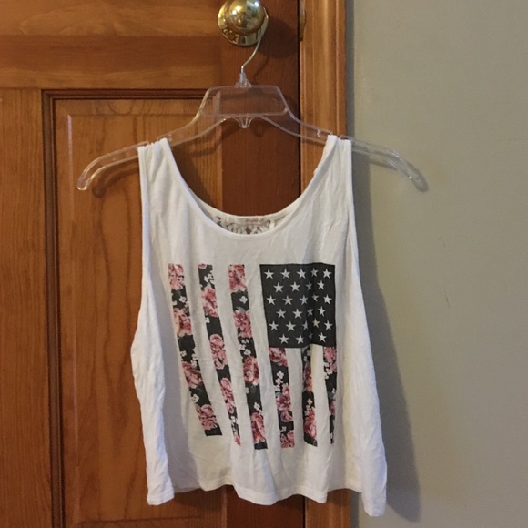This is a white tank top with an American flag design. The flag has a floral print inside the flag. There is a lace backing on the back of the tank top.
