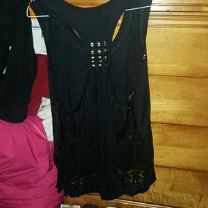 Black tank top with lace and strands of fabic on the back with studs on the front.