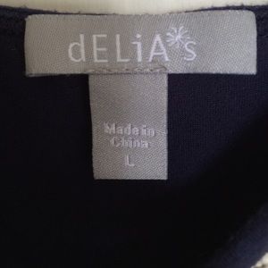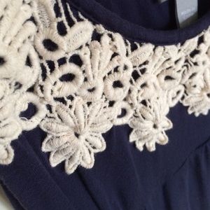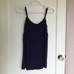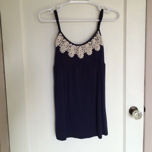 This is a dark blue tank top with doily like design on the top with adjustable straps. It is a large and the dimensions are from strap to bottom: 27 inches but adjustable, armpit to armpit: 15 inches. Also, only worn a few times.