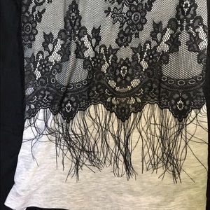 Light gray tank top with floral designs of black lace layered over. Frayed lace hanging at bottom of shirt. Inside gray is soft material.
