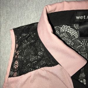 medium light pink tank with black lace accents on the shoulders and back. very little wear, good condition. light stain on lower right side.