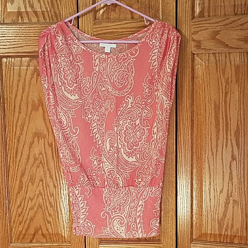 New York & co, sheer tank top with pink and cream paisley pattern, ruched shoulders and fitted bottom, in great shape