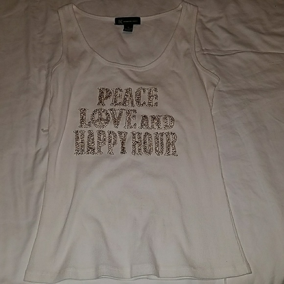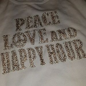 Off white tank top wity beaded phrase "Peace Love and Happy Hour"