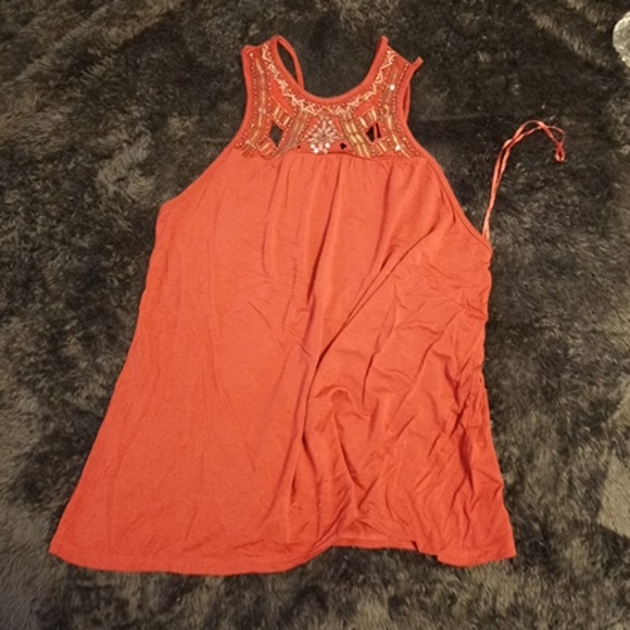 Orange tank top with bejeweled detailing at the neck line and a cut out back. Very cute for summer or to layer it any other time.