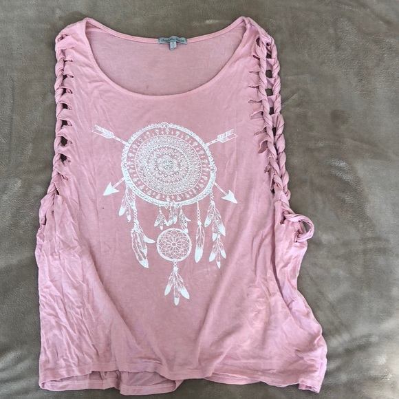 Small tank from Charlotte Russe. The arm holes open down past the rib cage and would look perfect with a bralette.