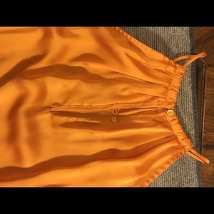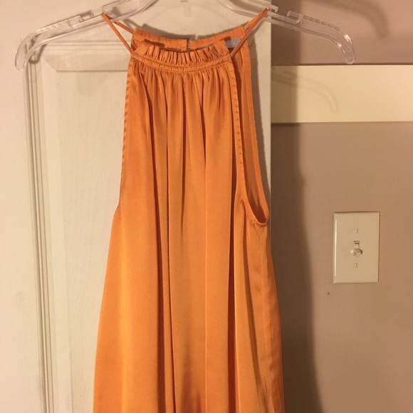100% polyester. Sleeveless. Spaghetti strap. Elastic waistband. Silky, shiny material. Can be dressed up or down. 2 button back with small key hole. Miniature pleat/ruffle on front part of neckline.