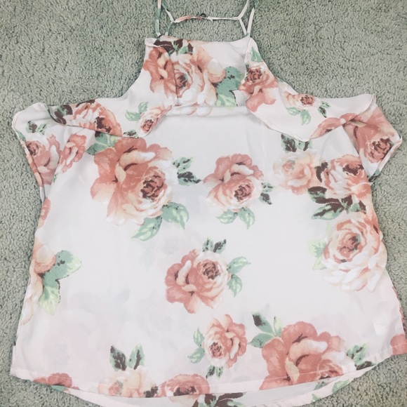 Forever 21 Open-shoulder floral top. Zipper down left side .