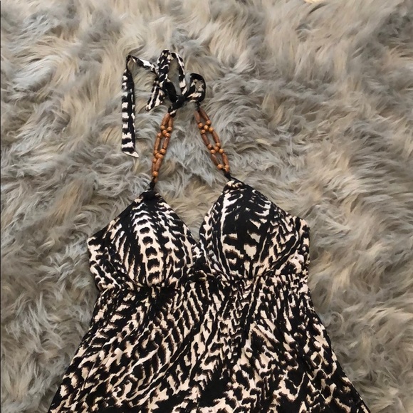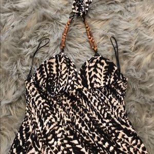 Adjustable tie on top Loose material Padding in the boobs already Stretchy material at the bottom of boobs
