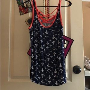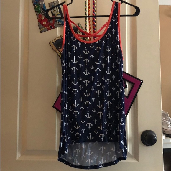 Dark blue with orange neck line white anchors maybe worn it twice.