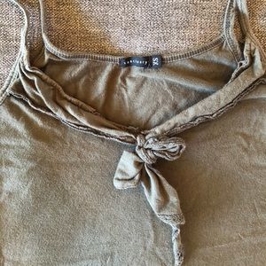 Super cute olive green tank top with fun ruffle at top & tie. Adorable combo of casual & cute. Size XS . Great condition