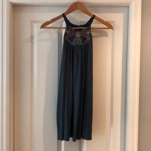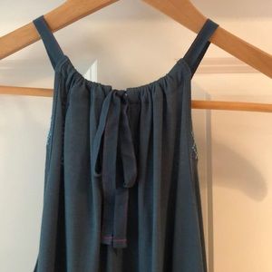 Hits high-mid thigh (I am 5’6” tall) great to tuck in to pants in front or let it flow long