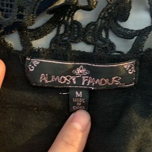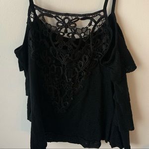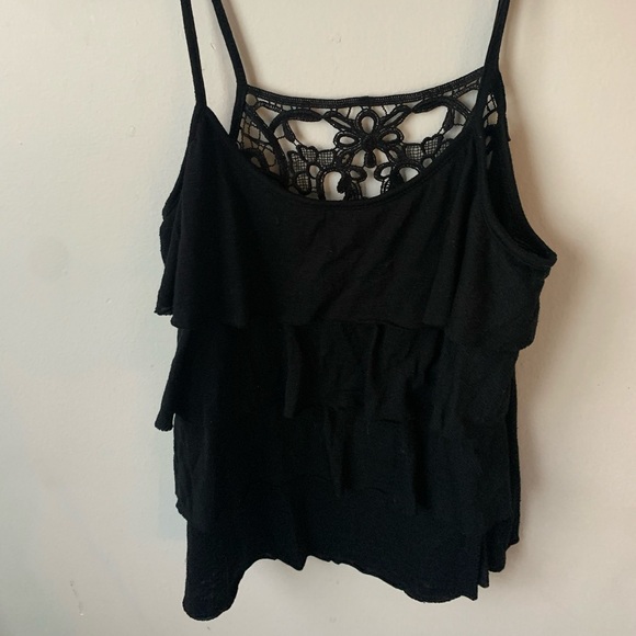 Cute ruffled black tank top. Straps cannot be adjusted. Size a medium but may fit more like a small. Since straps cannot be adjusted some cleavage may be visible when worn.