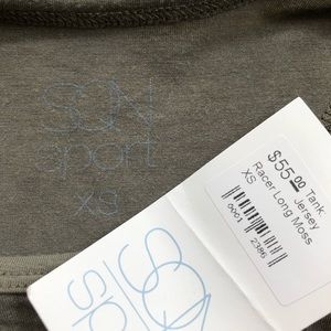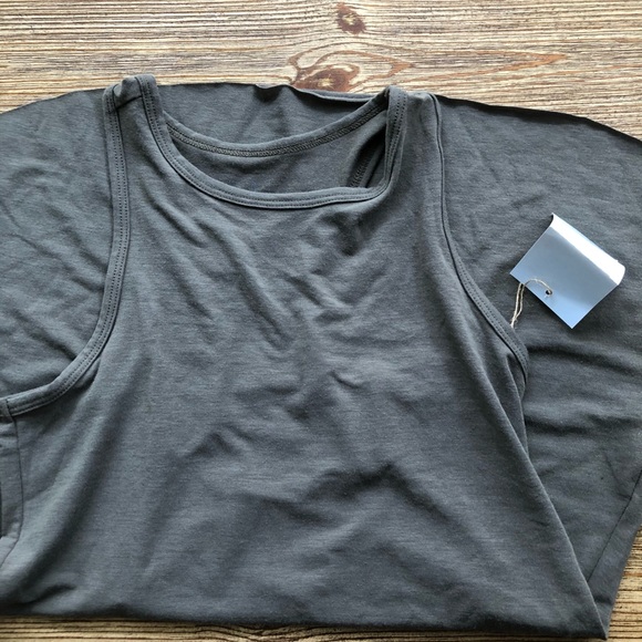 This racer back tank top is super soft and comfortable this is considered active wear so it is intentionally a longer shirt but not too long, just perfect so it doesn’t come up when you lift your arms. It’s size XS but would fit a petite medium size person. It looks grey but it is a grey olive color it is very nice.