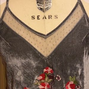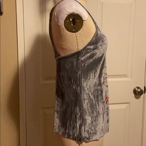 Stretch velvet tank top with lace on the back and see through yoke, embroidered at the front