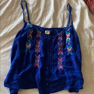 This tank top is super cute and flowy and adorable for the summer! It has a cute and fun colorful pattern on top of the beautiful royal blue color. There are buttons that go down the front and the straps are adjustable! Perfect condition :) tag says XL but fits more S/M
