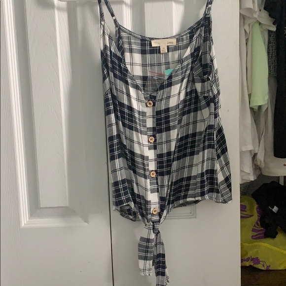 Brand new, never worn, plaid, cute tie on bottom, 4 buttons, extra button included, adjustable straps