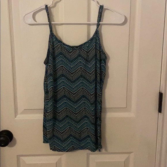 Turquoise, and a mixture of other blue colors. It’s an XL but fits like a M/L