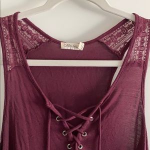 Maroon colored tank top. Soft flowing material. Crisscross tie strings in the front that are adjustable.