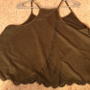 Super cute olive green crop tank with open hole detail around hem. Back has same detail with over lapping open back.