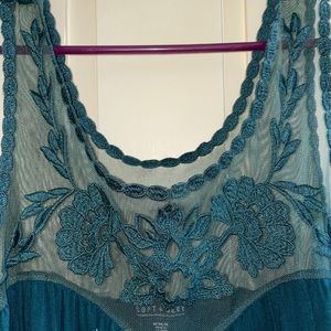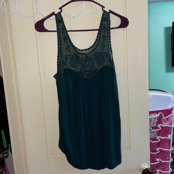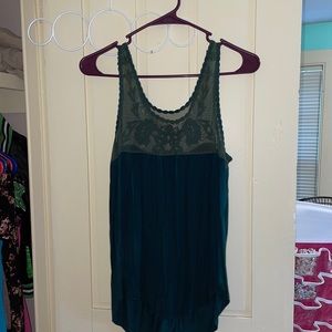 Soft, dark green tank top. Beautiful flower lace on top of the shirt and on straps