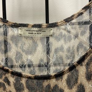 Tank top made from stretchy lace fabric, sells without cami, which will be needed underneath since fabric is sheer, new, made in LA, USA, garment twisted into a pouch which created a rose bud-perfect for a gift