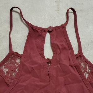 Maroon lace front tank top. Skinny straps, keyhole detail in the back with button closure. Fitted top, loose through the body.