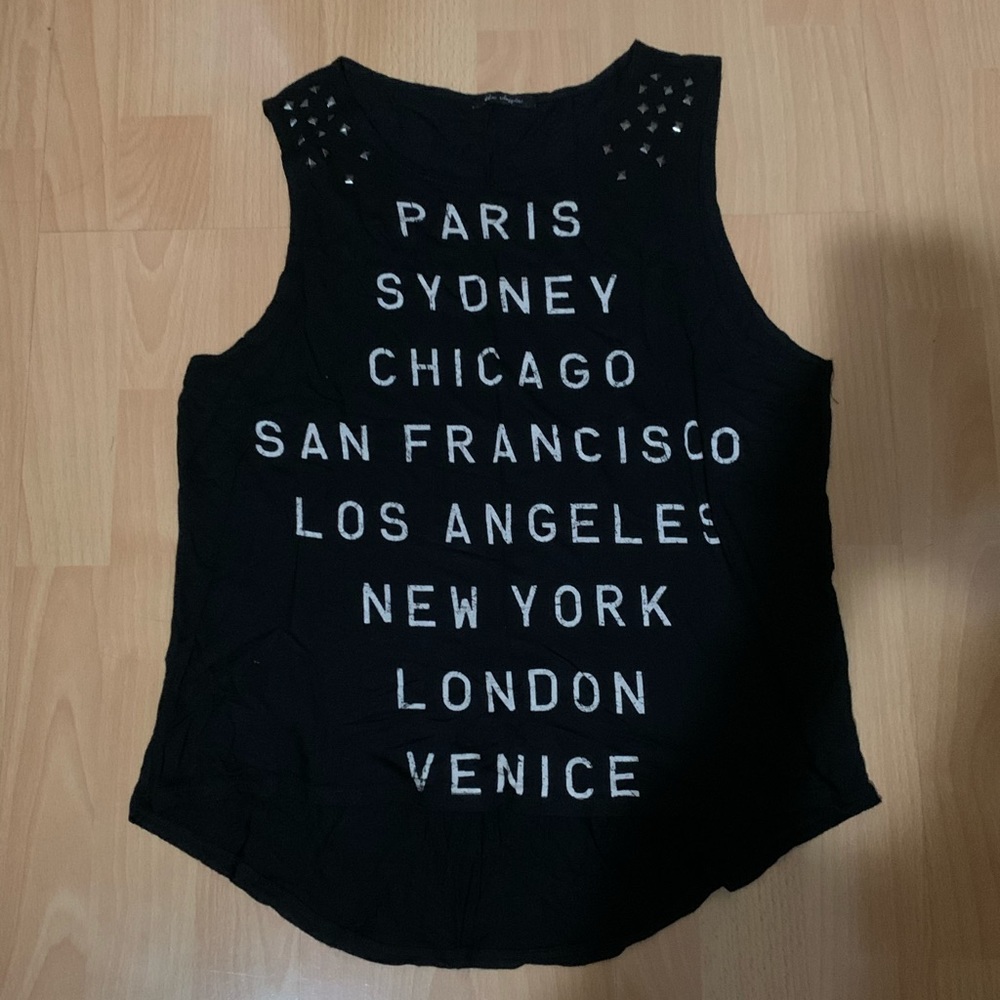 MESSAGE ME BEFORE BUYING :)) -Studded on the shoulders -Letters are faded but I think that’s the design -Black flowy tank -Does not have a size but fits small/medium