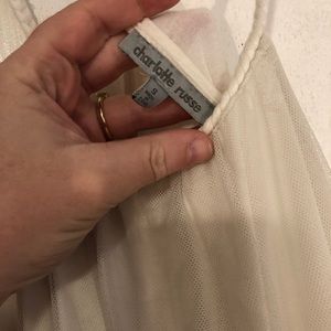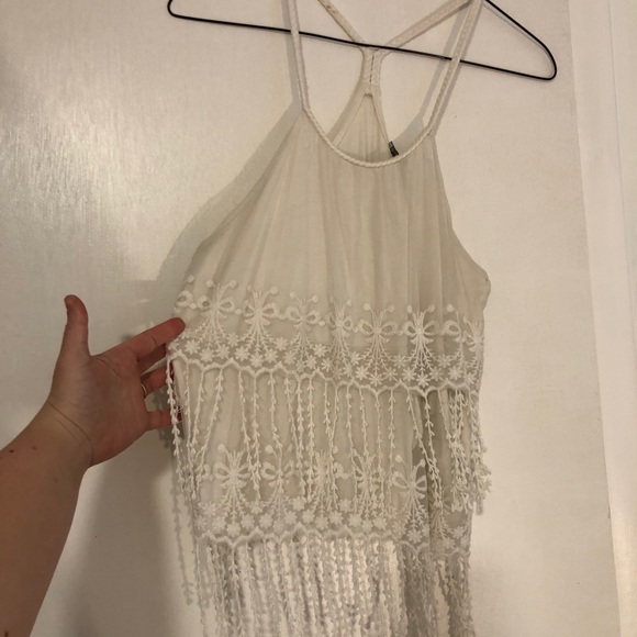 This white tank top is a little bit of a high neck, is slightly cropped and goes well with high waisted pants. Moderately worn so that will reflect in the price.