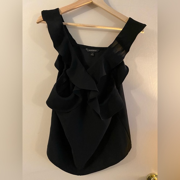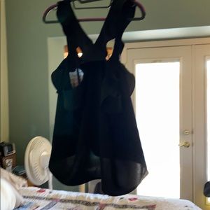 Black - criss cross ruffle straps in the front, vertical in the back. My chest is a bit too small to fill out this top.