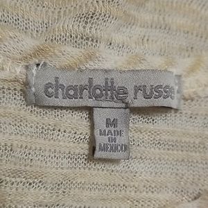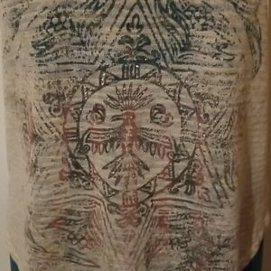 Knit tank top with multicolor tribal design and subtle rhinestones. Soft but slightly see-through material. Love it but I don't like how short it is on me. Size medium.