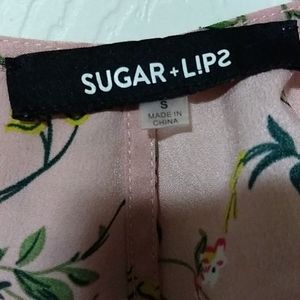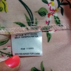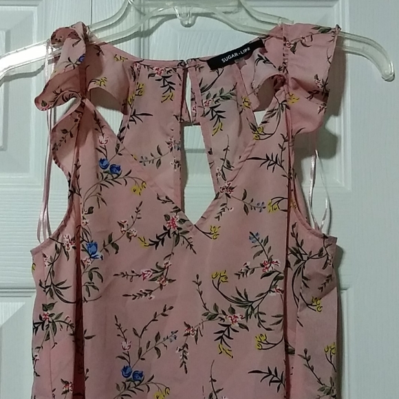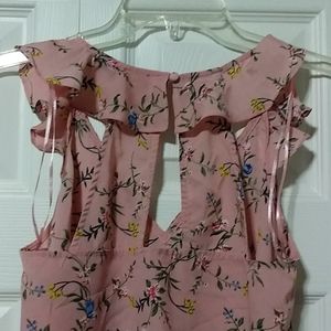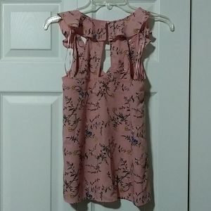 Like new Beautiful flowery tank top Ruffled on sleeves and back of neck Connects with a button on the back of neck Smoke free home Offers welcome