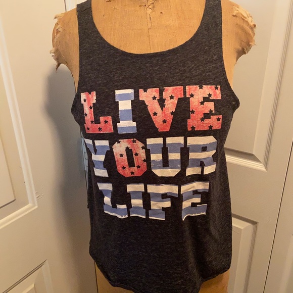 American Eagle tank top loosefitting Pitt to pit 20 inches pit to bottom 13 inches hips 24 inches. Scoop bottom with screen print live your life. Cotton poly blend