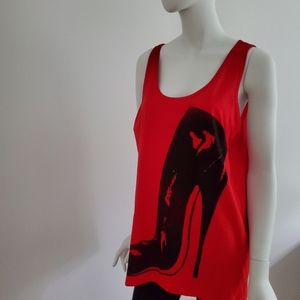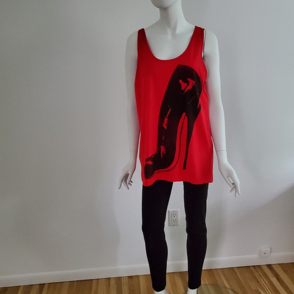 Long tank top with large black graphic stiletto on front. Tag is actually fun "GOLD WATCH" that can be cut off! This top was never worn.