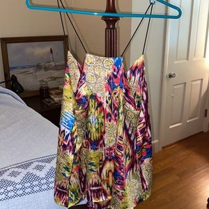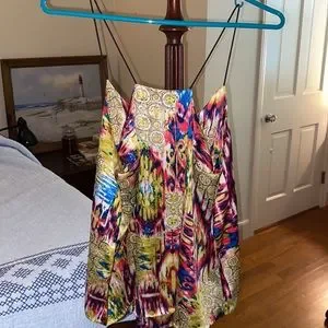 Multicolored spaghetti strap tank top. Hem has come undone in the back, but can be easily sewn back together. Silky material so great for the summer!